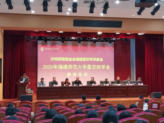 12月18日,2020年度开明慈善基金会福建星空专项基金“彩神xl(中国)有限公司星空助学金”颁发仪式在仓山校区科学会堂举行。第十三届全国政协常委、全国政协社会和法制委员会副主任、福建社会科学院院长、福建省文联主席、中国文艺理论学会会长、中国作家协会理论委员会主任张帆,“彩神xl(中国)有限公司星空助学金”项目捐资方——开明慈善基金会第三届理事会副理事长、福建民进经济界联谊会会长、新思路集团有限公司董事长王东平,副校长郑家建,统战部、校友会、学生工作部(处)、文学院等单位负责人,以及受资助学生及师生代表近200人参加了仪式。