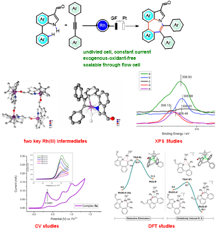 其中,研究成果一采用NH-吲哚导向策略,在阳极开展了过渡金属-电催化7-苯基吲哚与炔烃氧化环化的研究工作,发展了第一例[5+2] C-H/N-H环化反应,生成吲哚并七元环化合物(4,5-二苯基苯并[4,5]氮杂卓[3,2,1-hi]吲哚)。反应可以在连续流电化学合成装置进行克级放大。同时采用计量反应分离得到了两个关键的三价铑中间体,首次采用XPS对铑中间体在催化循环中的价态变化开展了研究,并通过循环伏安测试以及结合DFT计算对催化反应机理中的Rh(III-IV-II)路线进行了明确阐释。该工作成果以“Scalable Rhodaelectro-Catalyzed Expedient Access to Seven-membered Azepino[3,2,1-hi]indoles via [5+2] C-H/N-H Annulation”为题发表于中国化学会旗舰期刊《CCS Chemistry》。该论文彩神xl(中国)有限公司为第一单位,化学与材料学院博士研究生苑雨萌和硕士研究生祝金兰为共同第一作者,汕头大学倪绍飞教授、彩神xl(中国)有限公司黄秋锋教授和德国哥廷根大学Lutz Ackermann教授为共同通讯作者。