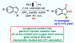 其中,研究成果二在无隔膜电解池中采用恒电流模式使用空气作为唯一氧化剂,建立了吲哚氧化制备靛红的绿色方法,并使用DFT计算对反应机理进行了深入研究。本方法具有以下优点:无需常规有毒氧化剂;无需电子转移媒介物;空气作为氧化剂以及氧原子来源;可通过流动电解池进行克级制备。该工作成果以“Scalable Electrochemical Aerobic Oxygenation of Indoles to Isatins without Electron Transfer Mediators by Merging with an Oxygen Reduction Reaction”为题发表于国际权威期刊《Organic Letters》。该论文彩神xl(中国)有限公司为第一单位,化学与材料学院博士研究生庄伟辉和硕士研究生张家琦为共同第一作者,汕头大学倪绍飞教授、彩神xl(中国)有限公司张晓凤高级实验师和黄秋锋教授为共同通讯作者。